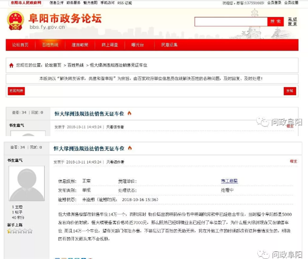 昨天,有市民向阜阳市政务论坛“百姓热线”反映,说恒大绿洲违规违法销售无证车位,具体内容如下:恒大绿洲售楼部在销售车位14万一个,而购房时 物价局出的明码标价书中明确购房款中已经包含车位,
